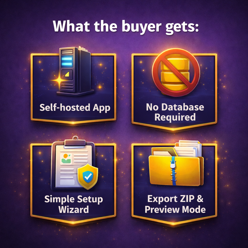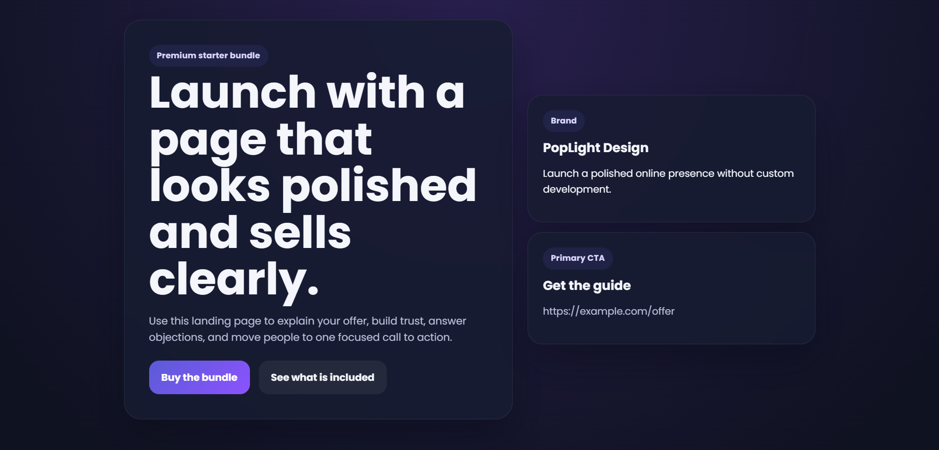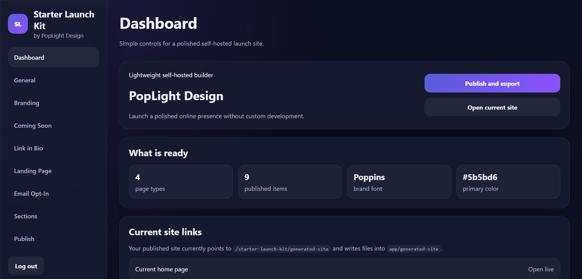 Starter Launch Kit by PopLight Design is a standalone self-hosted PHP app that helps buyers create a polished online launch presence without WordPress, a database, or a complicated CMS.